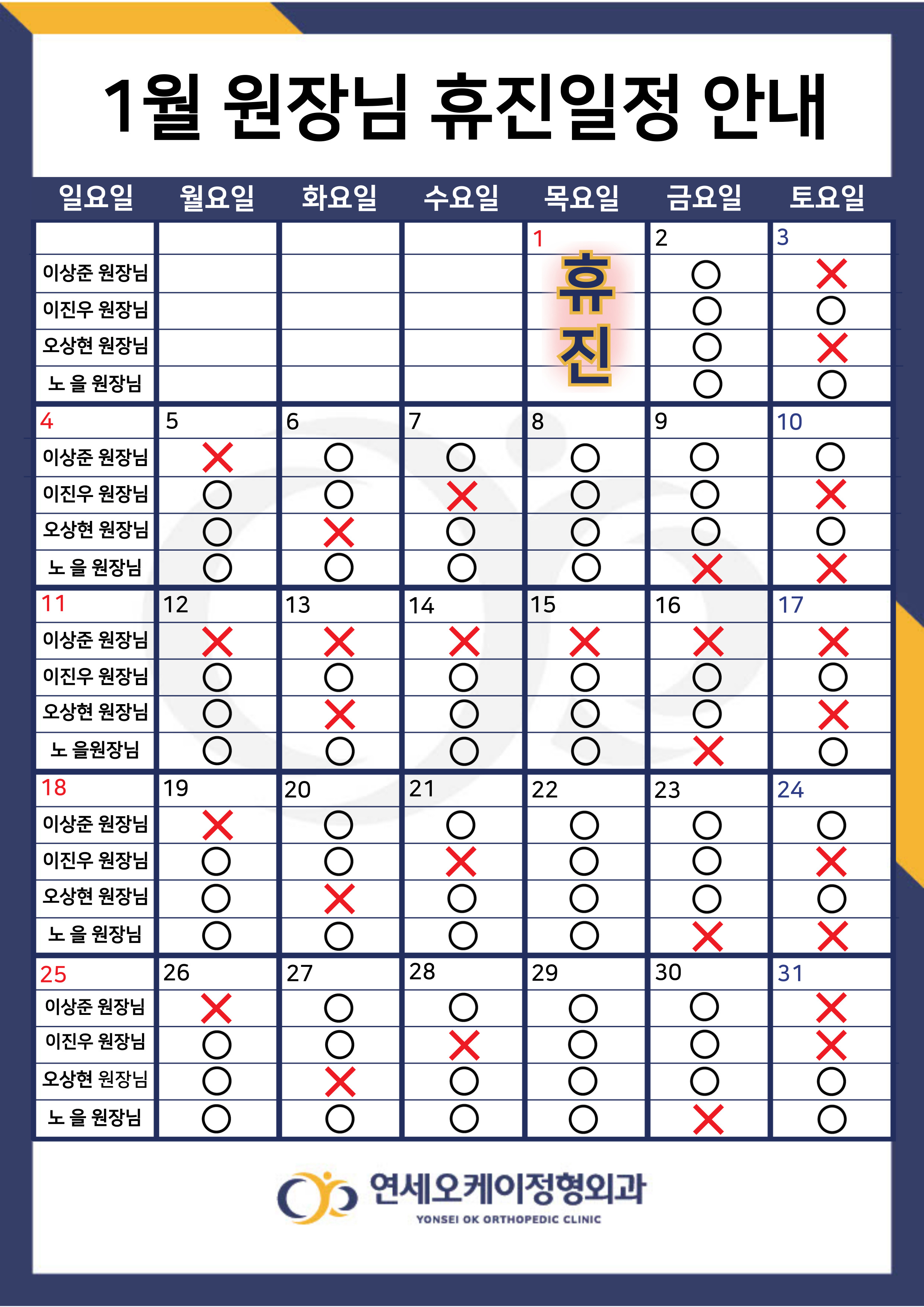 연세오케이정형외과 2026년 1월 원장님 휴진 일정 안내드립니다.