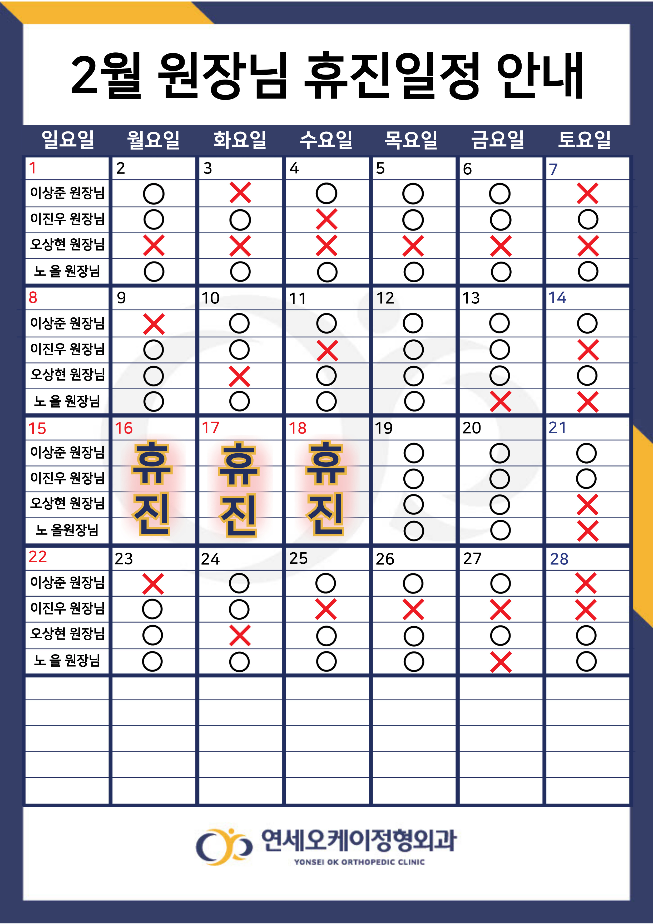연세오케이정형외과 2026년 2월 원장님 휴진 일정 안내드립니다.